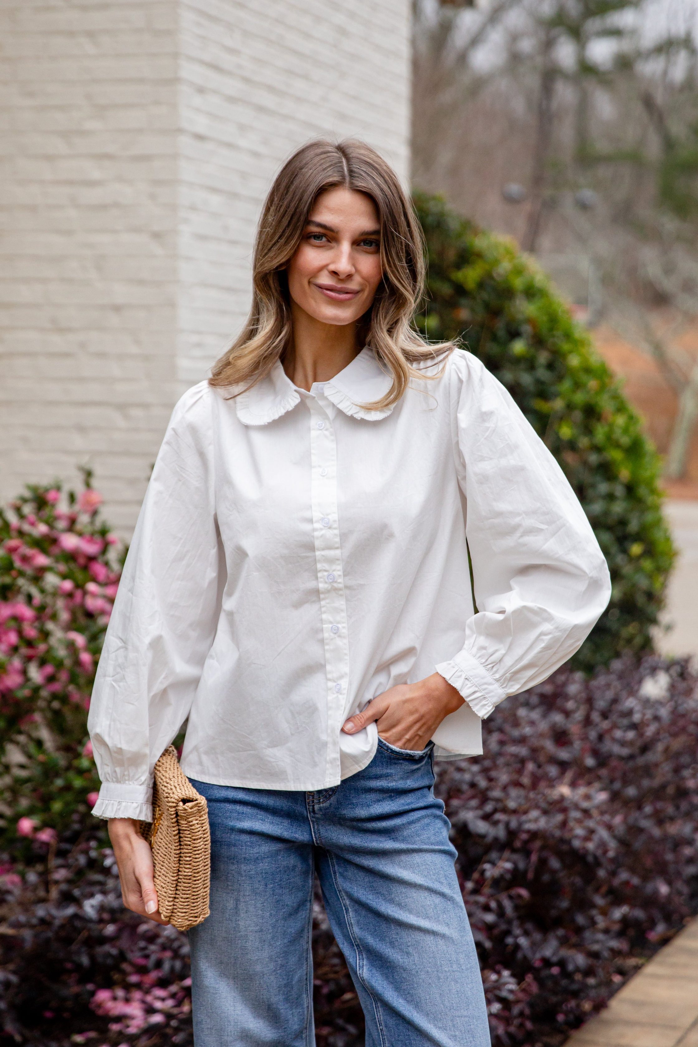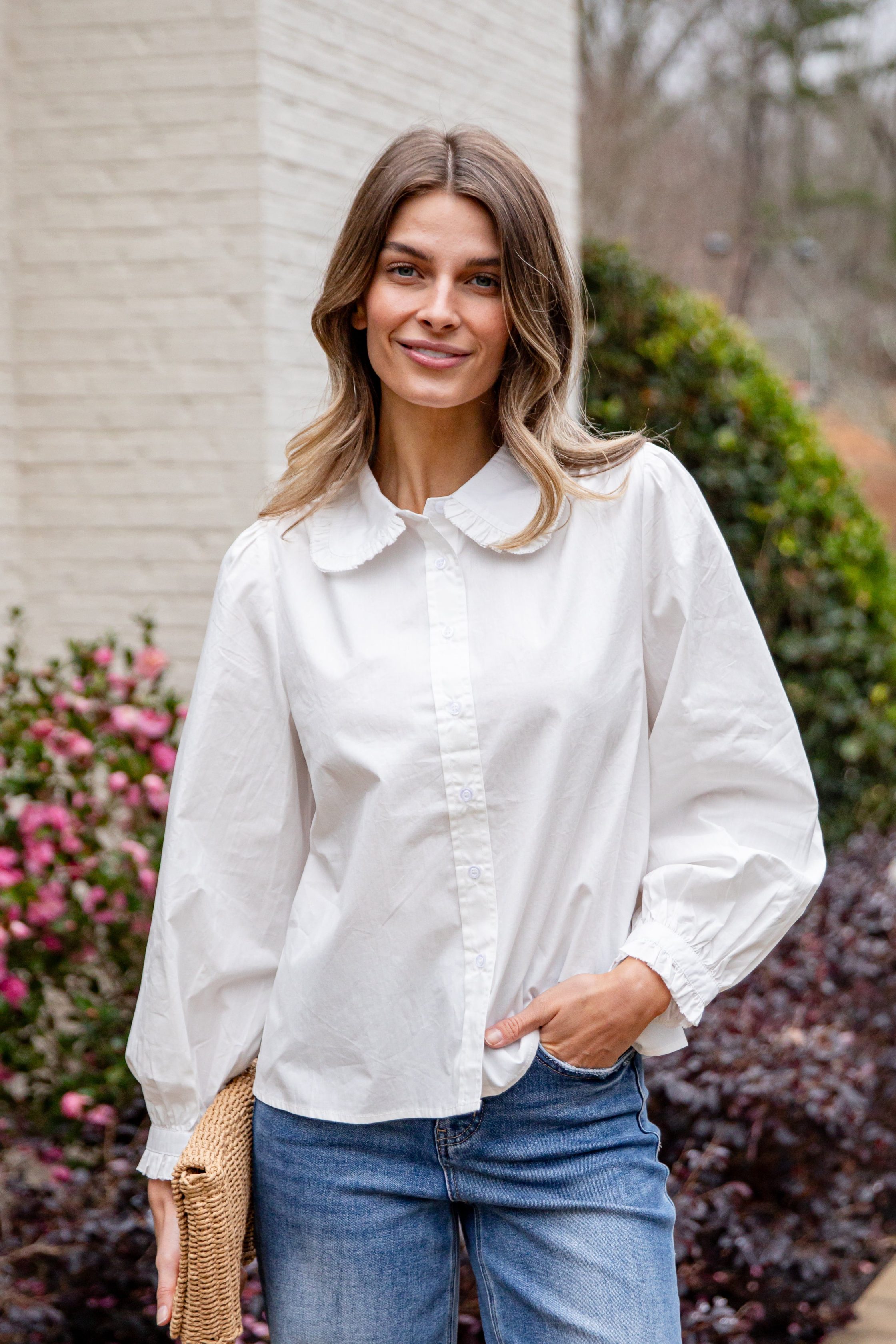 The Everyday Ease Button-Down Shirt is a timeless staple designed for effortless. polished styling. Featuring a lightweight woven fabrication with a relaxed. easy fit. this shirt is finished with a classic collar. full button front. and softly structured sleeves for an elevated yet wearable look. Perfect for dressing up or down. it can be worn tucked. half-tucked. layered. or styled open over a tank for endless versatility from weekday to weekend.