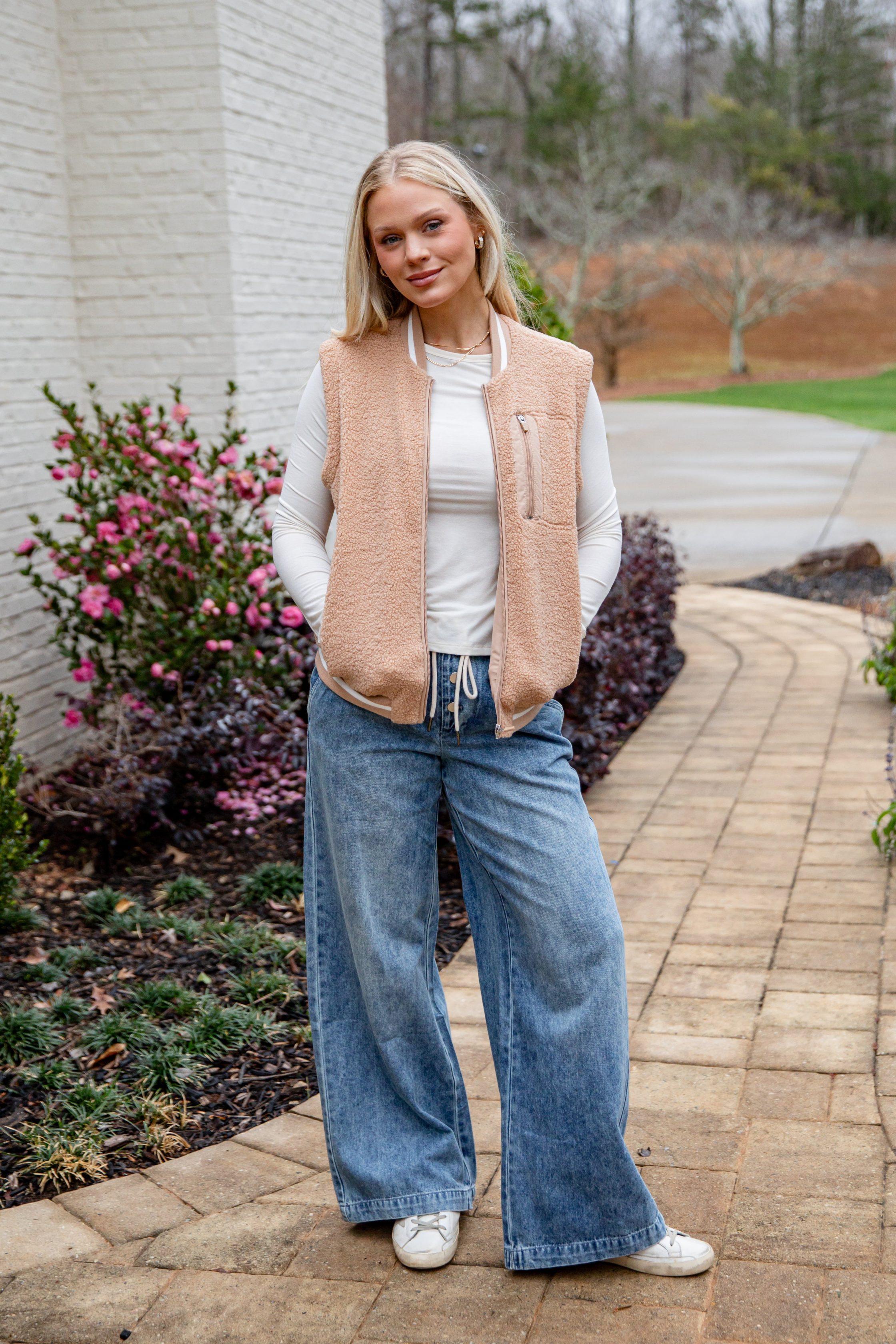 The Warm Intent Taupe Sherpa Zip Vest is the perfect cozy layer for cool January days. Designed with ultra-soft sherpa fabric and a relaxed fit. this vest adds instant warmth without feeling bulky. The neutral camel tone pairs effortlessly with denim. leggings. or matching lounge sets. making it an easy grab-and-go piece for errands. travel days. or casual weekends.